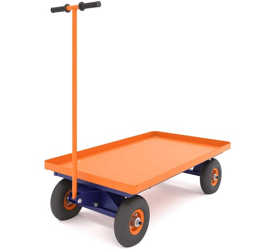 Для удобства перемещения негабаритного оборудования товаров возможна установка платформы борами вниз. Резиновые накладки на рукоятке обеспечивают надежный захват без эффекта проскальзывания рук. Прочная конструкция обладает четырьмя пневматическими колёсами диаметром 250 мм.