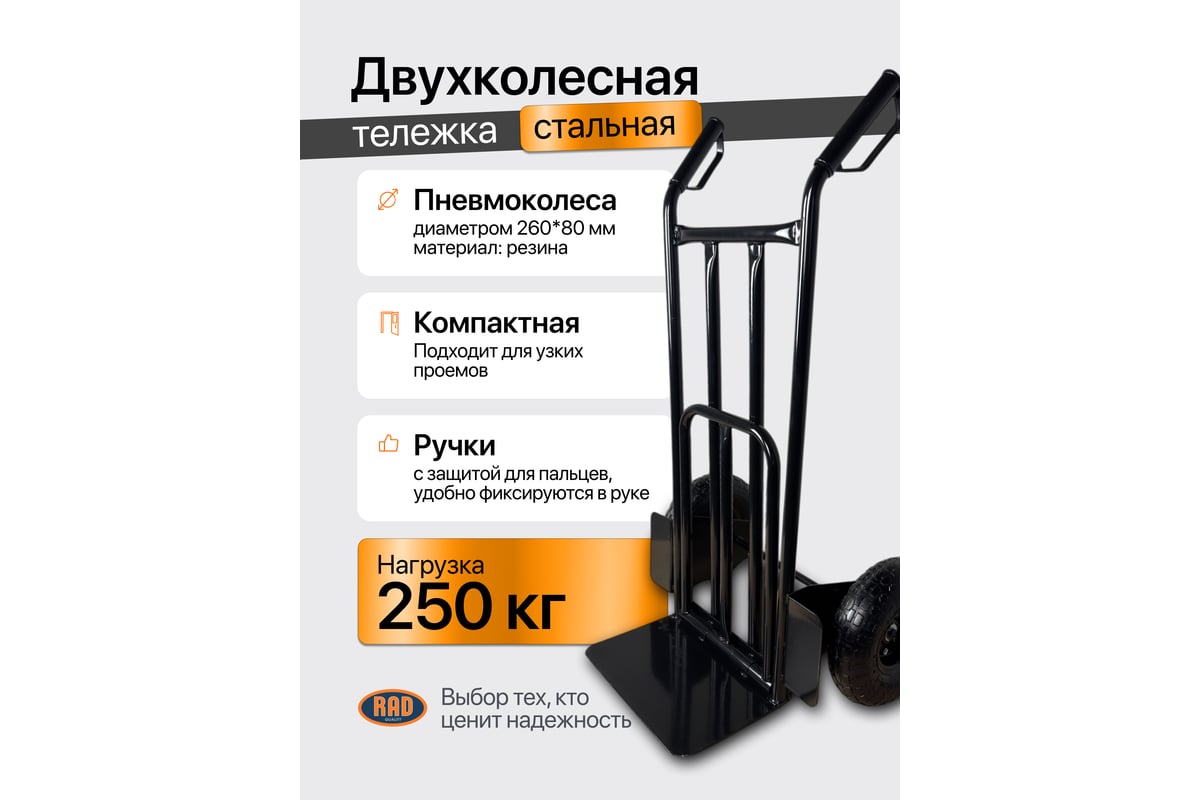 Двухколесная тележка RAD HT250P compact дополнительной откидной платформой 440x290 мм предназначена для работы на складах, производствах и торговых залах. Ее резиновые пневмоколеса позволяют ей без труда преодолевать неровности, а стальной корпус устойчив к повреждениям и деформации. Для удобства управления на рукояти установлены резиновые накладки. Дополнительная откидная платформа увеличивает площадь для установки груза, при этом тележка занимает меньше места при хранении. Платформа изготовлена из металла толщиной 3,3 мм.