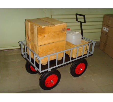 Прочная телега с высокими колёсами. Размер кузова оптимальный для сада и по хозяйству. Крепкие борта и пол из целого листа, а не из сетки. Аккуратно окрашена.