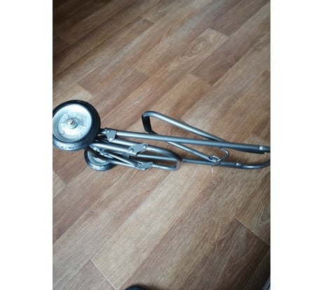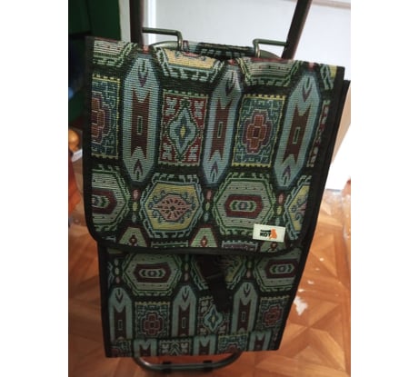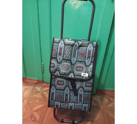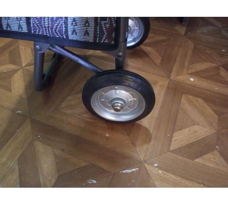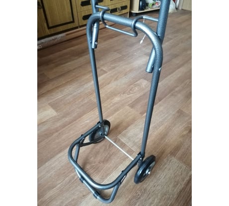 Отличная тележка. Рама металлическая, жёсткая, из трубки диаметром 16мм, покрытая молотковой эмалью. Высота очень удобная для большинства людей среднего роста. Сумка удобная, прямоугольной формы с жёстким вкладным дном внутри, легко надевается и снимается с рамы, при передвижении не сваливается на сторону. Колёса диаметром 13,5см жёстко закреплённые на оси и имеющие возможность сдвигаться по оси для смазывания и чистки.