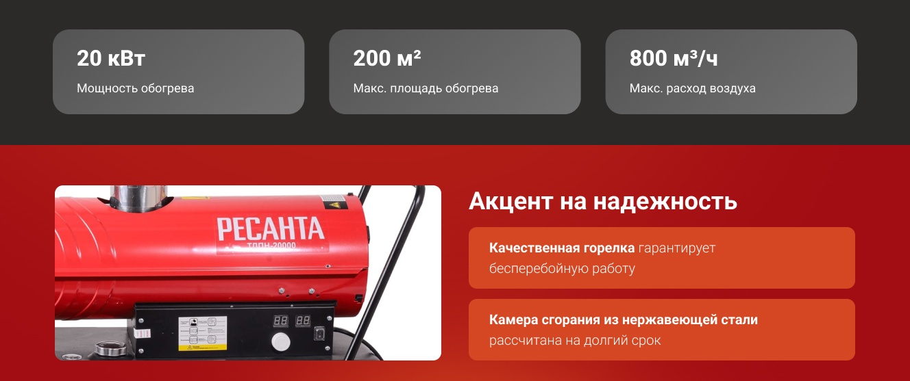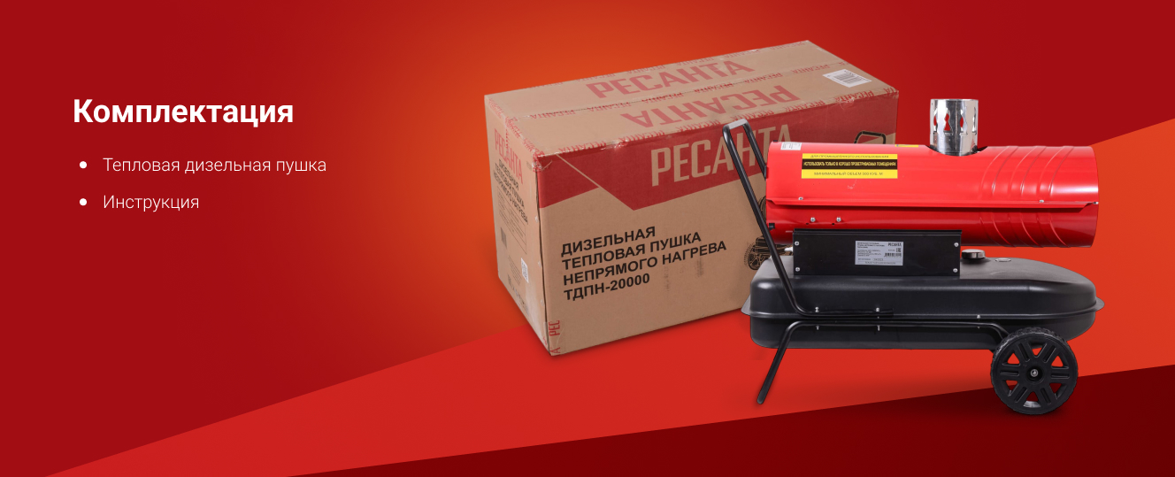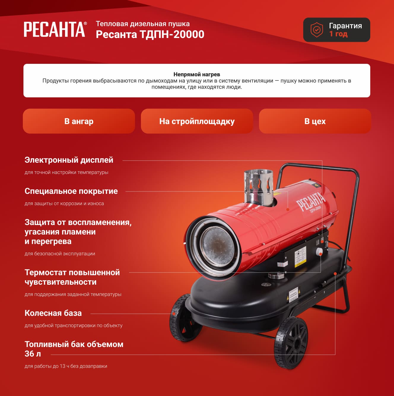 Мощная тепловая пушка Ресанта ТДПН-20000 с баком объёмом 36 л работает на дизельном топливе и подходит для обогрева нежилых помещений: складов, строительных объектов и производственных цехов. Теплопушка также может использоваться для усиления вентиляции. Ресанта ТДПН-20000 подходит для экономичного и быстрого обогрева помещений большой площади. Мощность дизельной теплопушки составляет 20 кВт. При этом её производительность достигает 800 м³/ч, а расход топлива – 1,58 кг/ч. Благодаря непрямому нагреву пушка также подходит для эксплуатации в помещениях с людьми. Для этого необходимо снабдить её системой отвода отработанных газов.