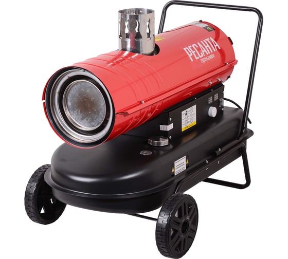 Мощная тепловая пушка Ресанта ТДПН-20000 с баком объёмом 36 л работает на дизельном топливе и подходит для обогрева нежилых помещений: складов, строительных объектов и производственных цехов. Теплопушка также может использоваться для усиления вентиляции. Ресанта ТДПН-20000 подходит для экономичного и быстрого обогрева помещений большой площади. Мощность дизельной теплопушки составляет 20 кВт. При этом её производительность достигает 800 м³/ч, а расход топлива – 1,58 кг/ч. Благодаря непрямому нагреву пушка также подходит для эксплуатации в помещениях с людьми. Для этого необходимо снабдить её системой отвода отработанных газов.