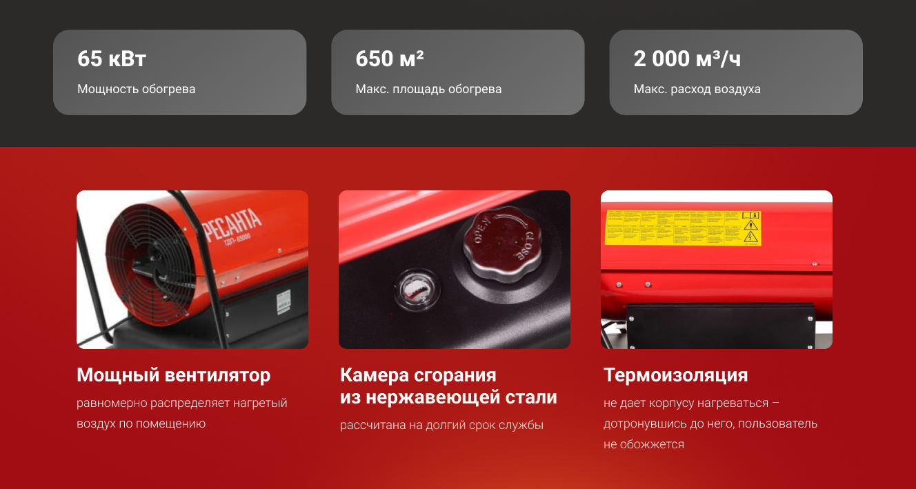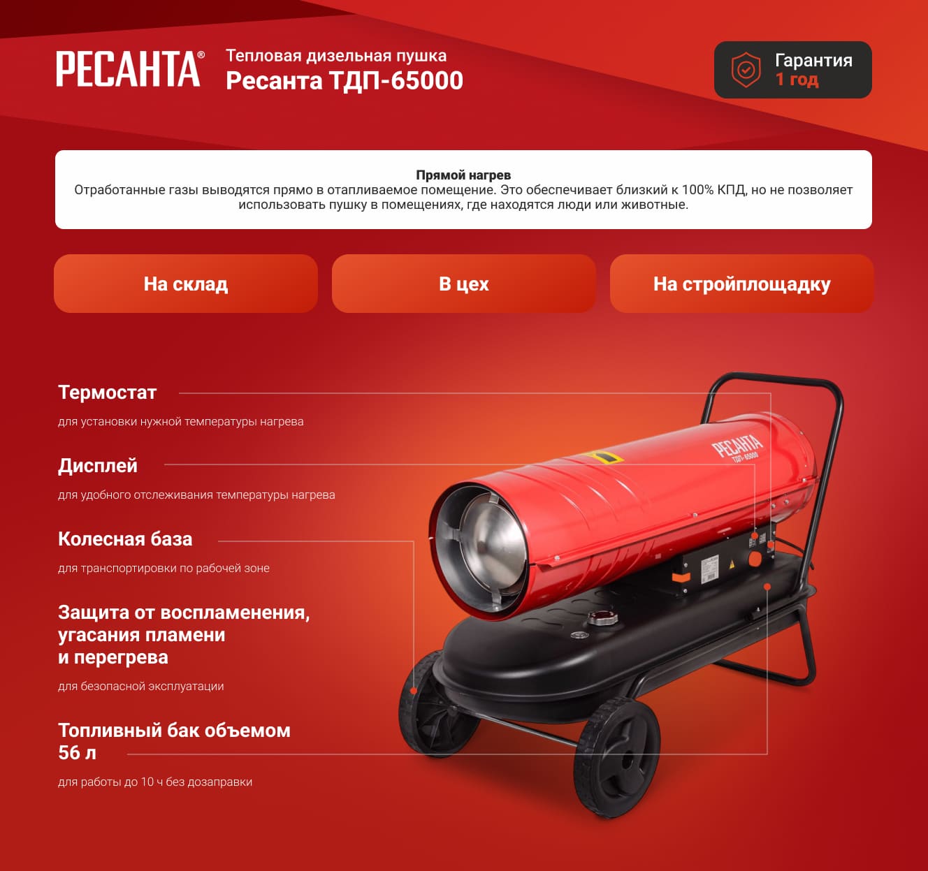 Мощная, производительная, удобная в эксплуатации, тепловая пушка Ресанта ТДП-65000 станет оптимальным решением задачи по обогреву производственного цеха, служебного помещения, автослесарной мастерской, любого другого объекта.