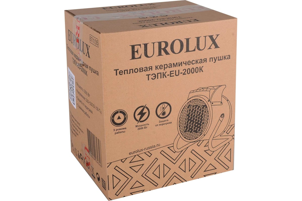 Теплопушка Eurolux ТЭПК-EU-2000K используется для отопления складов, торговых, общественных и других помещений, в т.ч. жилых. Электрическая тепловая пушка мощностью 2 кВт быстро нагревает воздух, поскольку комплектуется керамическим нагревательным элементом. Дуть теплым воздухом прибор начинает практически мгновенно после включения. Прибор работает в двух режимах нагрева (1 и 2 кВт), а также в режиме вентиляции.
