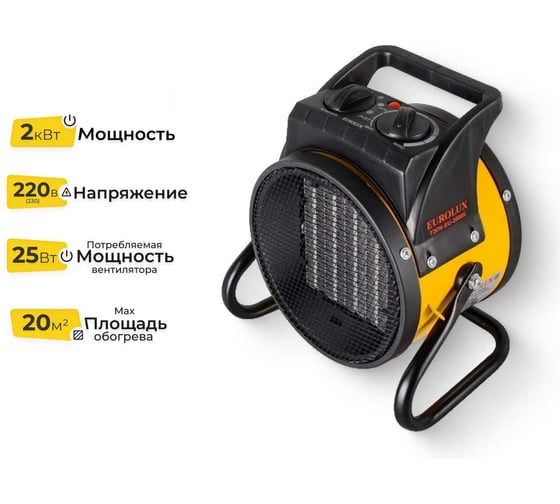 Тепловая пушка имеет круглый корпус, но при этом ее можно легко установить на полу в любом месте. Так как вес прибора составляет всего 1,63 кг, его можно без проблем переносить. Также Eurolux ТЭПК-EU-2000K отличается компактными размерами, что очень удобно при транспортировке.