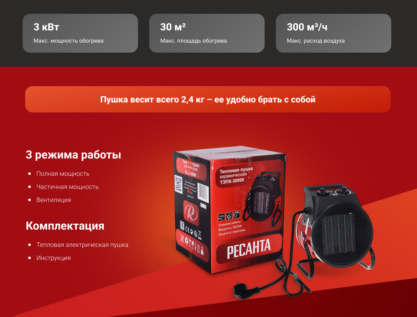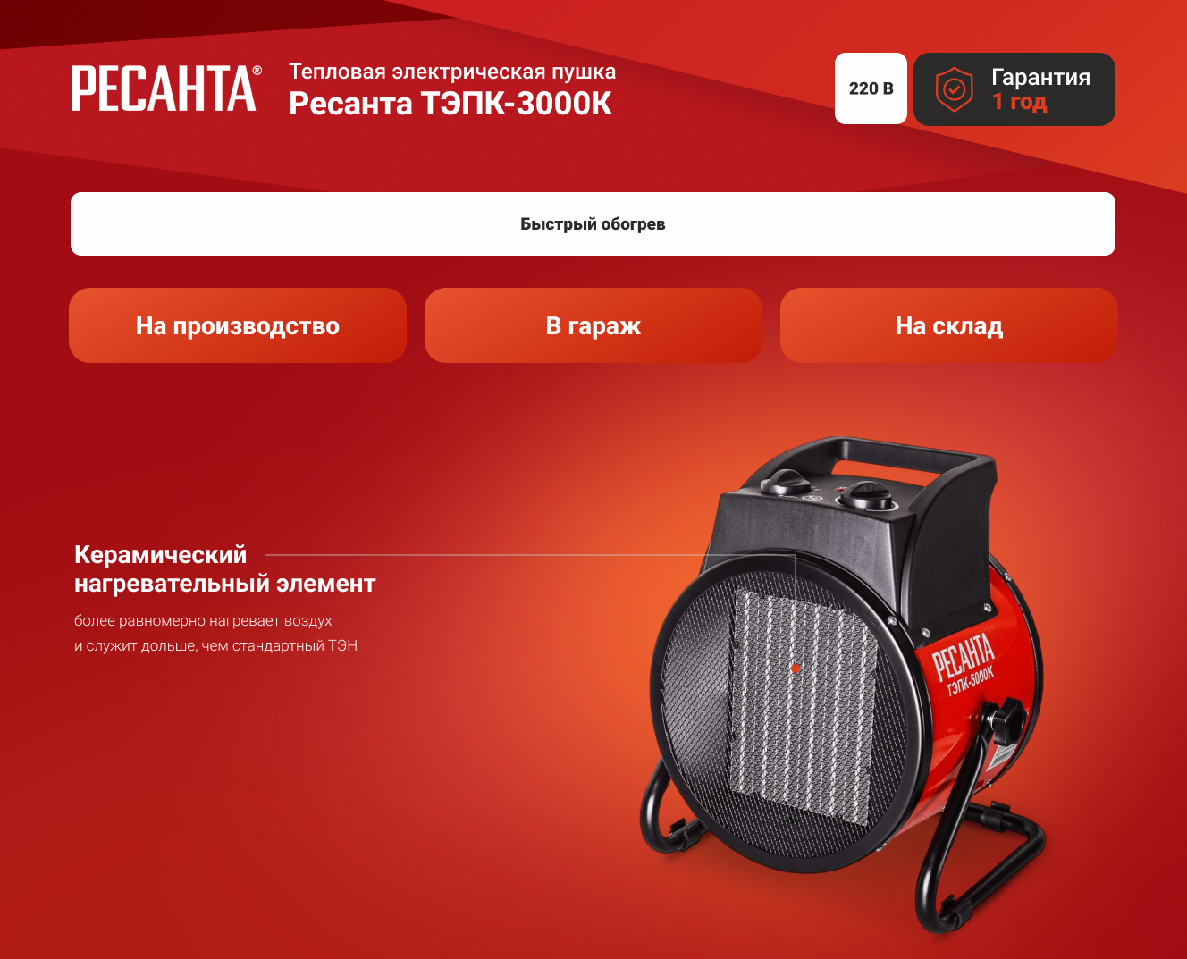 Ресанта ТЭПК-3000К — надежный и эффективный нагревательный прибор для установки в неотапливаемых жилых помещениях, на бытовых складах, в гаражах и производственных цехах. Тепловая пушка может работать в качестве обычного вентилятора с мощностью 25 Вт для просушивания погребов или автоматически поддерживать нагрев в двух режимах: 2000 Вт и 3000 Вт. Этого достаточно для обеспечения комфортной температуры на площади до 30 кв.м.