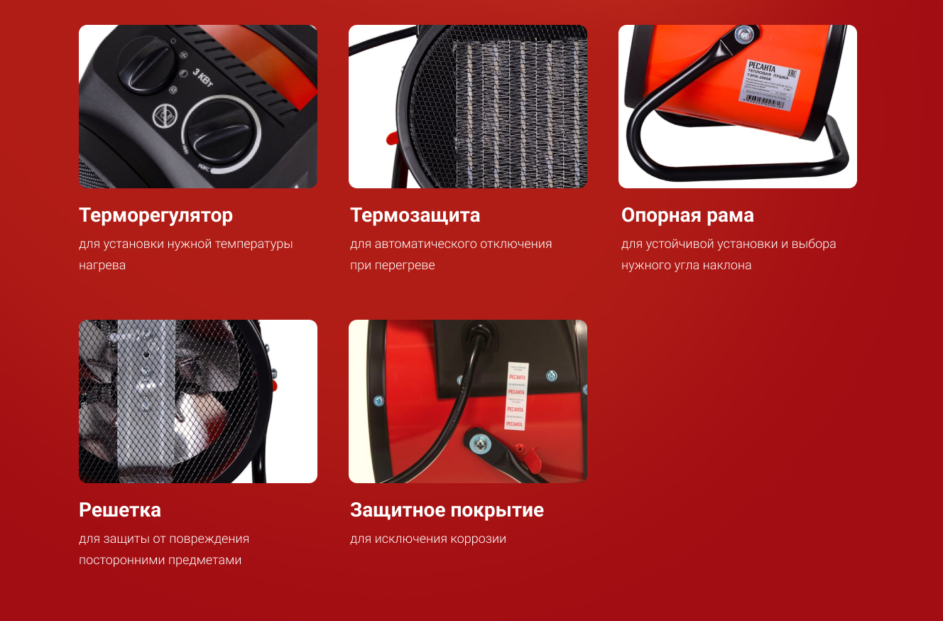 Благодаря небольшому весу и компактному размеру электрическую тепловую пушку легко перемещать и она не занимает много места. Автоматическая защита от перегрева делает эксплуатацию Ресанта ТЭПК-3000К безопасной и комфортной. Рекомендуется устанавливать оборудование на полу, исключая ковровое покрытие.