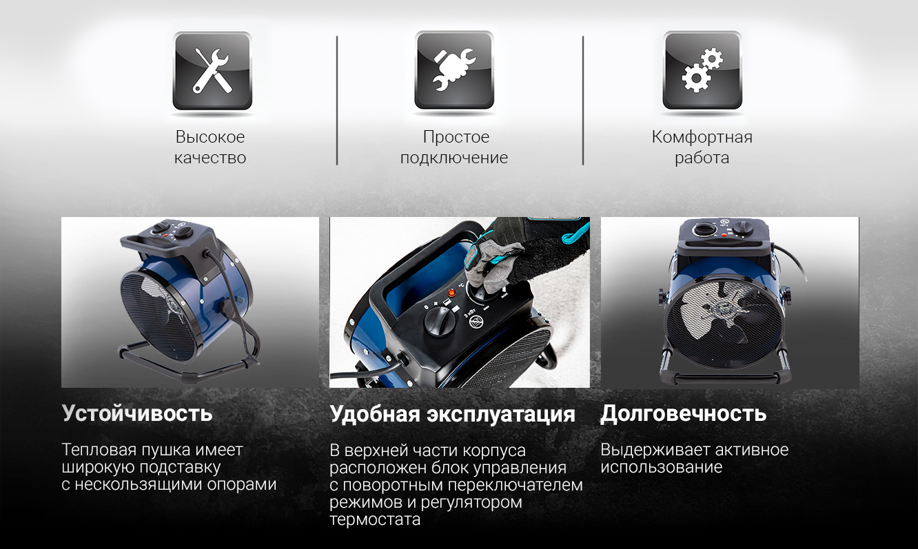 Преимущества СИБРТЕХ керамический нагреватель K3, 3 режима, 230В, 1500/3000 Вт