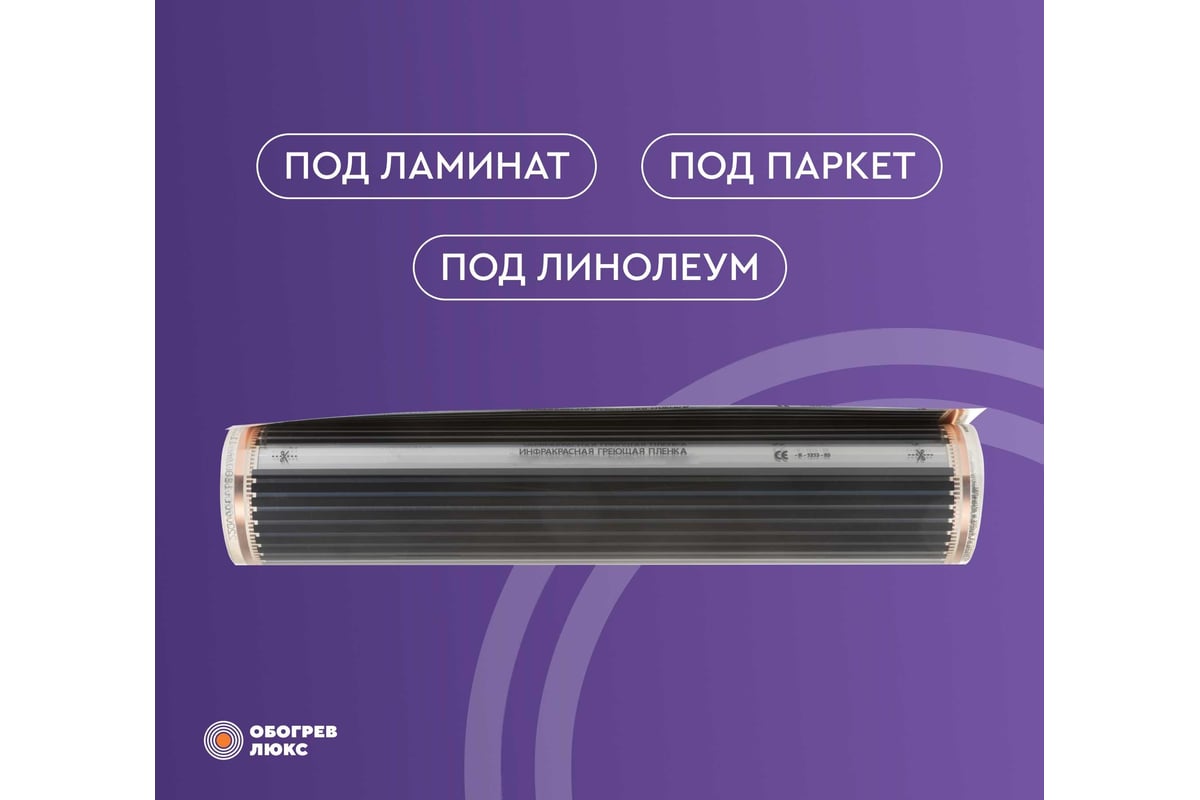 Тёплый пол Обогрев Люкс 12 м² инфракрасный, плёночный, без терморегулятора 50PL-2640 ‒ вид теплого пола для установки под ламинат, паркет, линолеум, мармолеум. Ширина рулонов нагревательной плёнки составляет 50 см. Полосу требуемой длины нарезают вдоль специальной линии отреза, повторяющейся с фиксированной периодичностью (обычно 25-30 см). Состоит тонкий пол из защитной прозрачной пленки и плоских тепловыделяющих карбоновых элементов с токопроводящими медными лентами, нанесенных на полимерную основу.