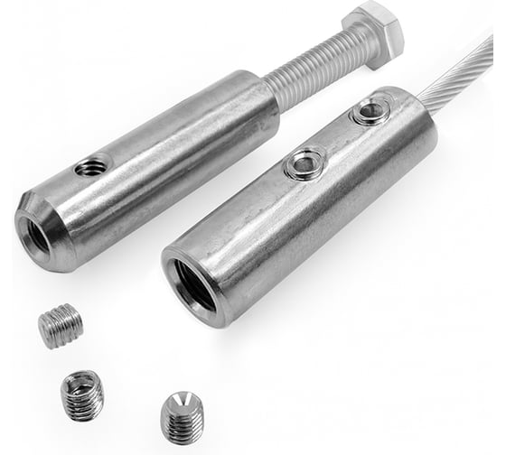 Изделие применяется для монтажа растяжек и ограждений на основе нержавеющего троса.