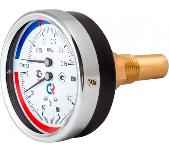 Термоманометры Росма ТМТБ-31Т.2 до 150°С 6 бар предназначены для измерения температуры и избыточного давления неагрессивных к медным сплавам сред в системах теплоснабжения и водоснабжения, бойлерах, паровых котлах и т. д. Термоманометр объединяет в одном корпусе манометр и термометр, имеет две шкалы — давления и температуры. Прибор комплектуется клапаном, позволяющим демонтировать термоманометр без разгерметизации системы.
