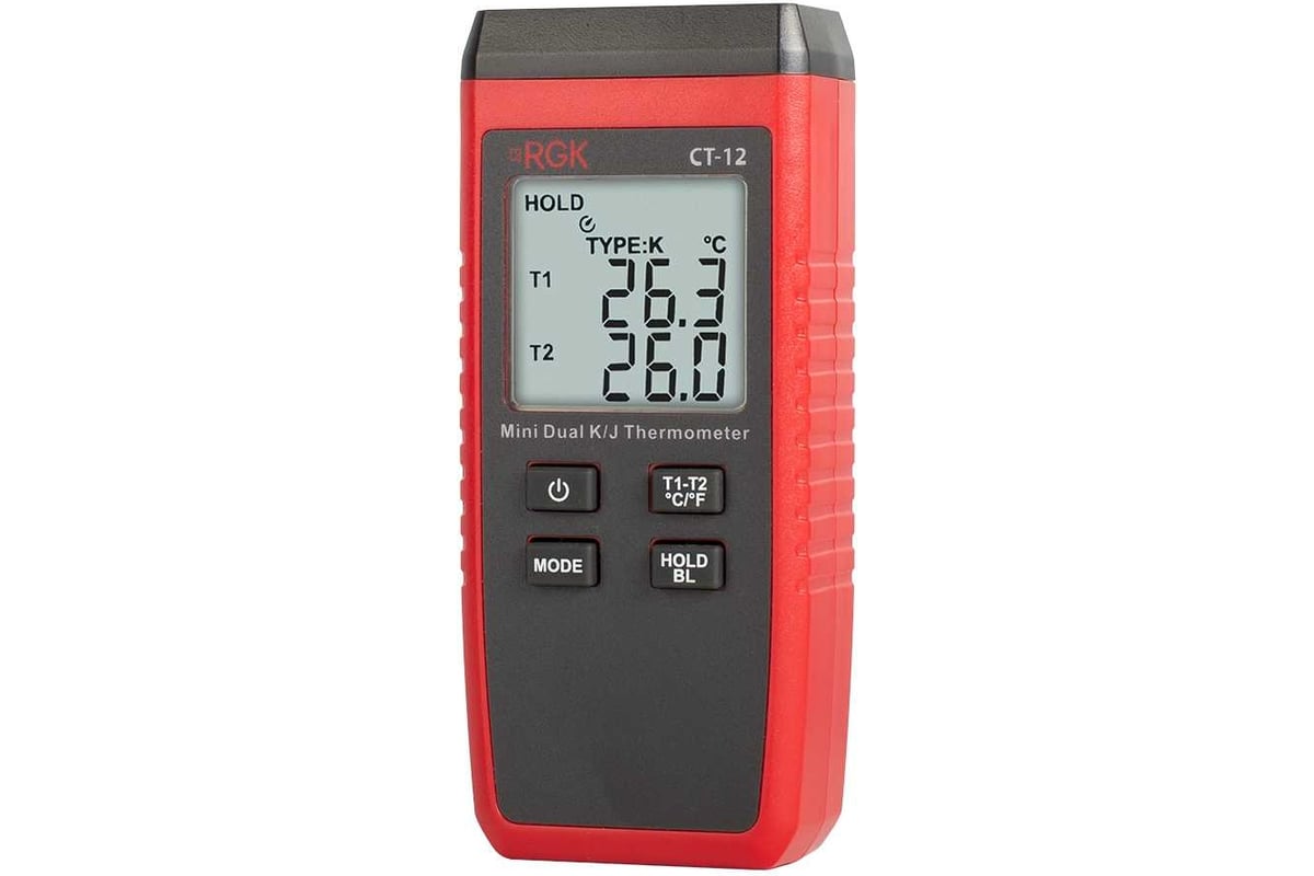 Специальная индикация оповещает специалиста о ненадлежащем подключении или неисправности термопары. Двухканальный цифровой термометр RGK CT-12 с поверхностным зондом TR-10S также сообщает о превышении предела измерений и низком уровне заряда элементов питания. Измерение пиковой и средней температуры упрощает реализацию различных сценариев проверки, особенно при работе с крупными объектами.