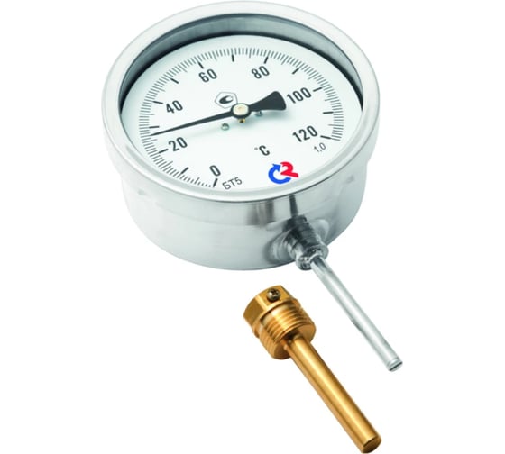 Термометр 00000010861 общетехнический Тип БТ, серия 211, радиальное присоединение в комплекте с защитной латунной гильзой. Термометр радиальный биметаллический предназначен для измерения температуры жидкостей, пара и газов в отопительных и санитарных установках, в системах кондиционирования и вентиляции. Принцип действия прибора основан на зависимости деформации чувствительного элемента от измеряемого значения, °C. В качестве чувствительного элемента используется биметаллическая пружина. Она изготавливается из двух прочно соединенных металлических пластин, имеющих различные температурные коэффициенты линейного расширения. При изменении температуры пружина изгибается и вращает стрелку термометра. Один конец пружины закреплен внутри штока, а к другому присоединяется ось стрелки. Корпус прибора изготавливается из коррозионностойкой стали, шток - из нержавеющей стали. Регулировка: на штоке При измерении температуры агрессивных сред рекомендуется использовать термометр биметаллический с гильзой из нержавеющей стали. Область применения: системы кондиционирования, теплоснабжения, водоснабжения. Климатическое исполнение: группа C2 по ГОСТ Р 52931; УХЛ категории 2.1 по ГОСТ 15150 Рабочее давление (на гильзе): латунная гильза с погружной частью длиной до 100 мм - 10 МПа латунная гильза с погружной частью длиной более 100 мм - 2.5 МПа гильза из нержавеющей стали 08Х18Н10 - 25 МПа.