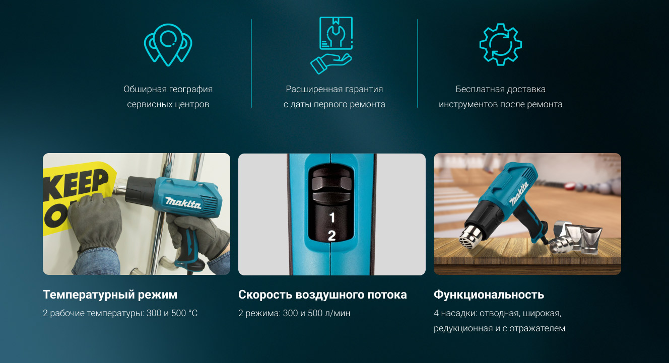 Простой макитовский фен. Температуру выхлопа не измерял, но греет так, что непонятная древняя советская краска, которую не хотели брать растворители краски, прекрасно снимается. Из недостатков - насадки на фен не очень плотно сидят в своих гнездах и, порой, вываливаются. И главный недостаток - отвратительный запах из кейса.