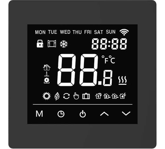 Терморегулятор M62 VA Черный - это надёжное и удобное устройство для точного управления системой обогрева в жилых и коммерческих помещениях. Он подходит для электрического тёплого пола, включая нагревательные маты, греющий кабель, инфракрасный (плёночный) тёплый пол, а также для систем тёплый пол под плитку, под ламинат, под линолеум и другие популярные типы покрытий.