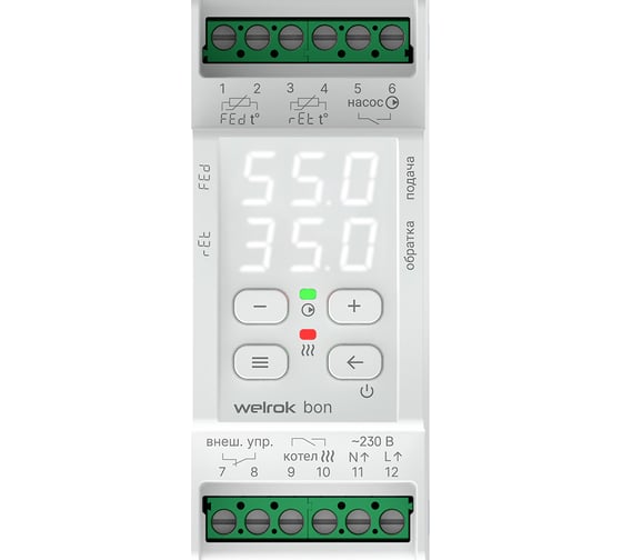 Welrok bon для управления электрическими системами отопления на основе электродных или ТЭНовых котлов обеспечивает комфорт и безопасность эксплуатации котла благодаря контролю температур подачи и обратки, а также возможности управления насосом и отслеживания его состояния.