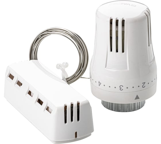 Жидкостная термостатическая головка с настенным датчиком предназначена для поддержания в помещении требуемой температуры воздуха путём регулирования расхода теплоносителя через отопительный прибор. Термочувствительный элемент предназначен для настенного крепления и соединен с термоголовкой капиллярной трубкой. Данное решение применяется в тех случаях, когда термоголовка установлена за плотной шторой, в нише, за экраном и температура воздуха вокруг неё не соответствует средней температуре воздуха в помещении.