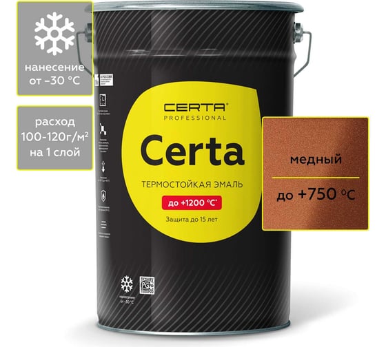 Термостойкая краска для металла, печей, мангалов, радиаторов, дымоходов, суппортов Certa до 750 градусов, медный, 25 кг CPR0003325 - это профессиональный продукт, который ранее был доступен стратегически важным секторам экономики. Состав изготавливается по уникальной запатентованной формуле на полиорганосилоксановой основе. Используется для окрашивания металлических, бетонных, кирпичных, цементных и оштукатуренных поверхностей (камины, мангалы, двигатели, детали, машины и другие).