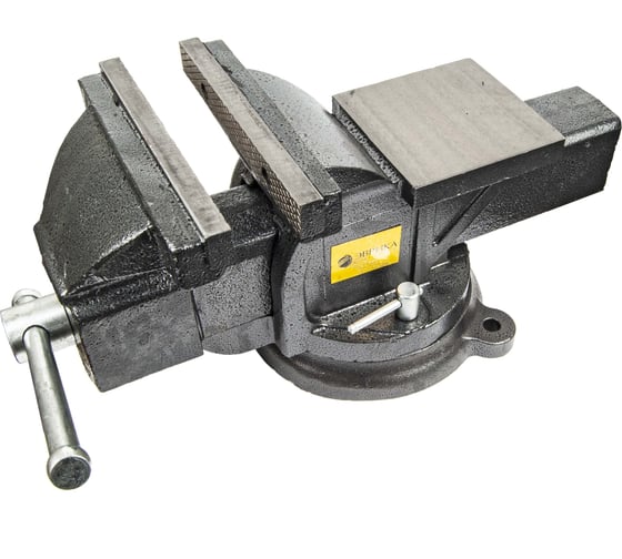 слесарные поворотные тиски с шириной губок 200 мм (8 дюймов), предназначенные для надежной фиксации деталей. Изготовлены из чугуна, оснащены наковальней, трубным захватом и поворотным основанием (360°), что обеспечивает универсальность при слесарных работах.