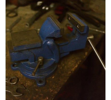Поворотные тиски выполнены из высокопрочной стали, что гарантирует их долговечность и устойчивость к нагрузкам. Закалённые стальные губки с насечкой обеспечивают надёжный захват заготовок, предотвращая их смещение во время работы. Поворотное основание позволяет легко изменять угол фиксации деталей, а монтажные отверстия обеспечивают стабильное крепление к верстаку или рабочему столу.