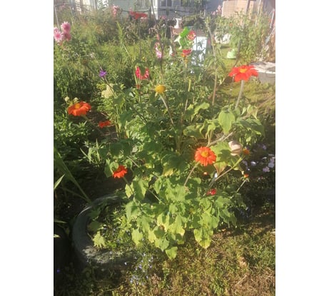 Роскошные высокие кусты высотой 100см. Родина титонии – Мексика, ее называют еще мексиканским подсолнухом. Стебли красноватые, слабо опушенные. Растение при всей своей мощности не требует подвязки. Соцветия крупные корзинки диаметром 5-8 см, красной окраски, с желтой серединой, напоминают немахровые георгины. Цветет с конца июля до заморозков. Используют в групповых посадках в миксбордерах.