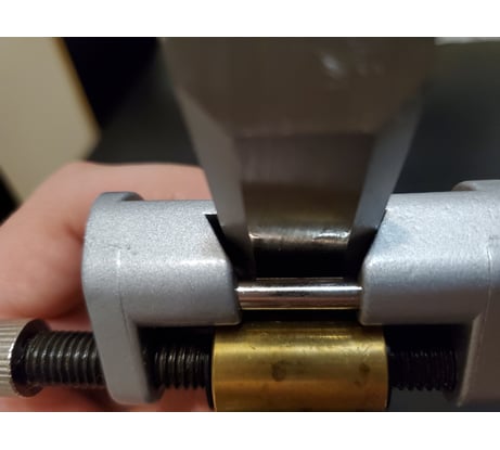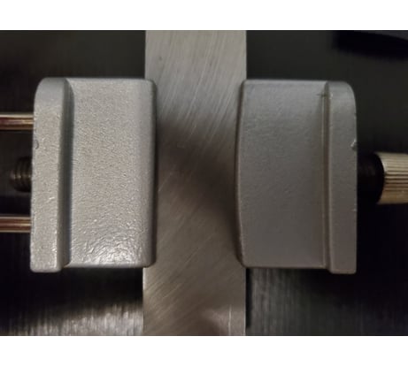 В начале зажав стамеску увидел неравномерный зазор между губками и стамеской, промерил цифровым штангелем расстояние от точилки до каждого из краев стамески и показания разошлись на 0,1 мм. С мыслями что зажимает криво расстроился и решил делать возврат. Но уже ради эксперимента проверил угол стамески поверочным угольником и увидел что у нее хромает геометрия как раз примерно на 0.1мм, сделал пометку, зажал еще раз в точилке и все совпало - расстояние от точилки до более высокой грани стамески больше на ту самую десятку. Значит стамеска просто не идеальная, по почему губки не слева и справа не равномерно прижимают стамеску??? Внимательно рассмотрев увидел что одна губка прямая, а вторая выполнена с изгибом в центр как снаружи, так и внутри. При установке надо опирать стамеску на прямую губку и все должно встать ровно. Если не психовать, а внимательно разобраться с точилкой все вопросы снимаются сами собой