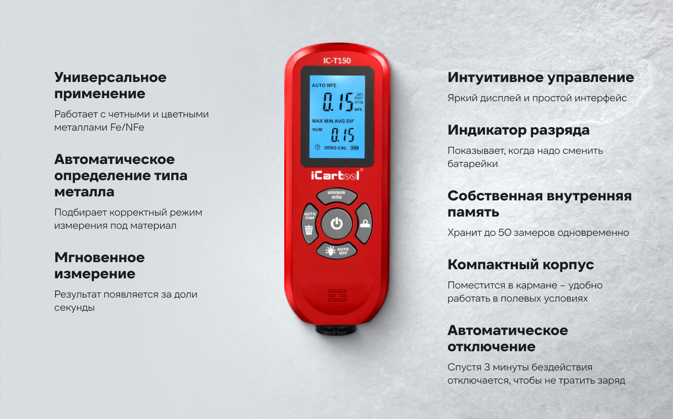 Если вы покупаете автомобиль с пробегом, занимаетесь автоподбором или просто хотите быть уверены в идеальном состоянии кузова — iCarTool IC-T150 станет вашим незаменимым помощником. Этот компактный, но мощный прибор позволяет в считанные секунды определить толщину лакокрасочного покрытия, выявить следы ремонта, перекраса или шпаклёвки — даже там, где глаз не видит.
