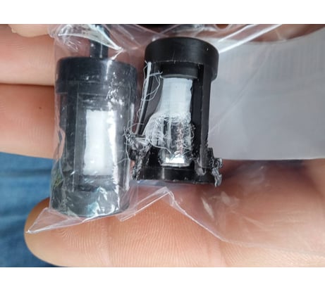 Фильтр топливный черного цвета. Корпус полностью пластик, внутри что-то похожее на металлический штифт. Фильтрация предполагается через нейлоновую сетку. Диаметр внешний 4.4мм, внутренний 2.4мм. В качестве проигрывает металлическому фильтру, но цена невысока. Покупался для использования в бензопиле gigant.