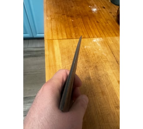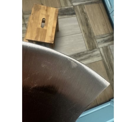 Все криво-косо, есть ряд огрехов на лезвии. Заточки нет (хоть и написана, что ручная). Насажен криво, надо снимать и доводить до ума.