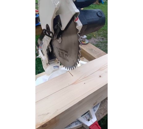 Комплектный диск пилит ровно. Брус 100х150 влезает, 145х145 уже нет, но можно немного отодвинуть брус к себе, подложить за него брусок и в 3-4 приема распилить.