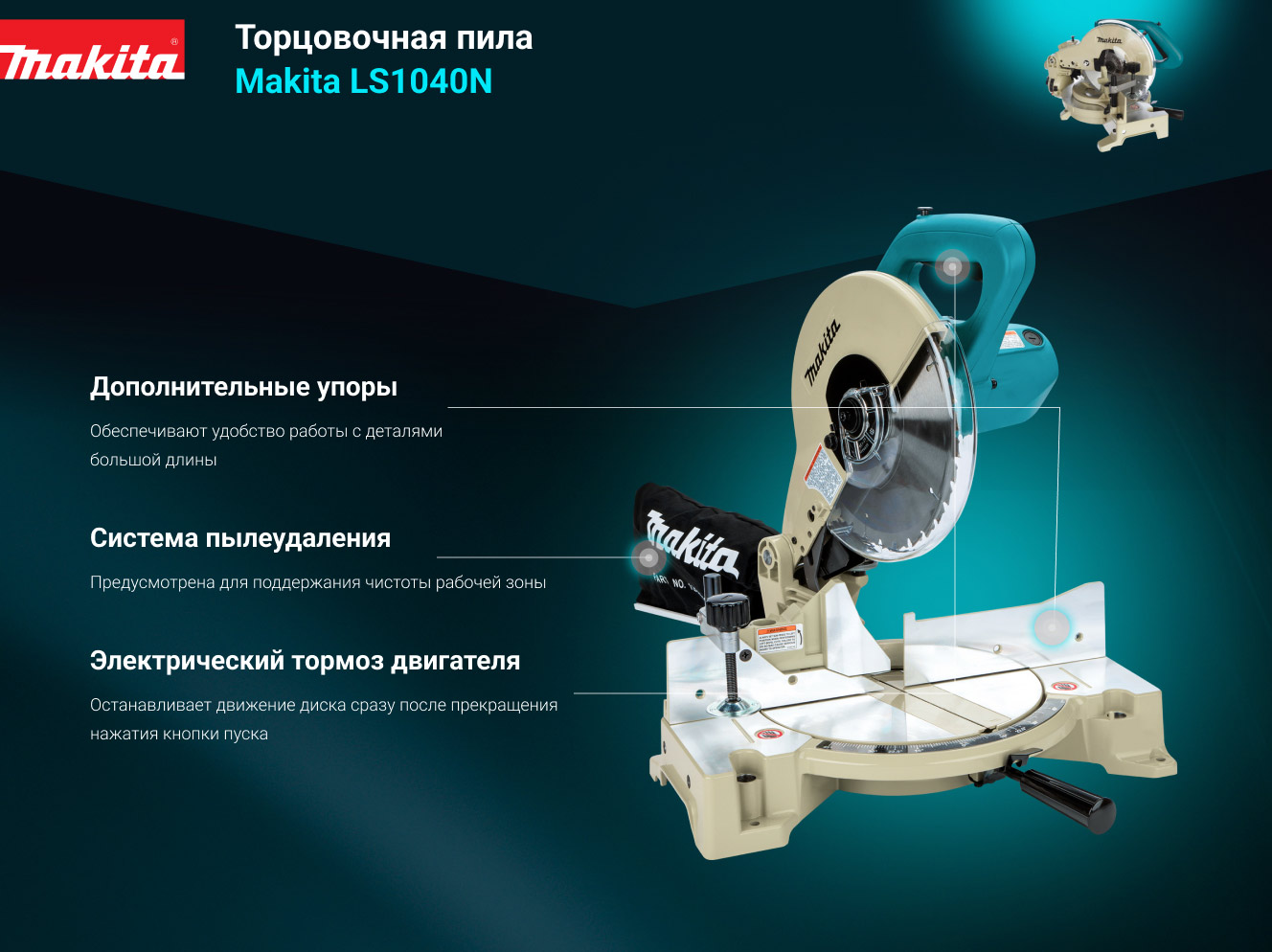- Мощный двигатель Makita LS1040N для тяжелых работ