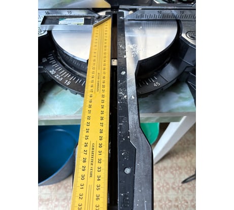 Не сразу заметил и не пойму, можно ли исправить: два отдела направляющей шины не образуют прямую линию. Попробовал сделать фото и схематично нарисовать. Слева прямой угол получается по отношению к распилу, диску, справа идёт под небольшим углом.