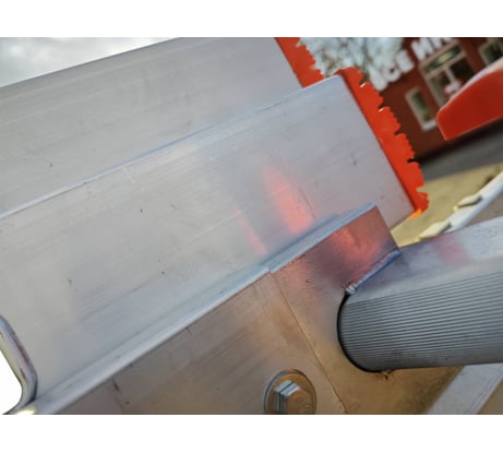 Ограничитель располагается так, что чтобы выдвинуть лестницу на максимальное расстояние приходится танцевать с бубном - этот ограничитель мешается, но я думаю просто удалю его и избавлю себя от такого недостатка. Хотя будет хромать безопасность. Опишу сам процесс: для раскладывания лестницы сначала нужно самую узкую выдвинуть максимально вверх, потом среднюю выдвигаем вверх (в пределах ограничителей). Но на данной лестнице если выдвинуть первую секцию, то вторая упрется в направляющие для режима "стремянка" практически сразу. Ещё один недостаток это фиксаторы (зацепы), при переноске лестницы пару раз отсоединялись, было неприятно когда лестница разбирается в руках. Могли бы сконструировать какие то пружины, которые обеспечат надёжность данного узла.