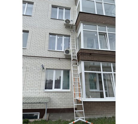 Хорошая, очень устойчивая лестница, купил для работ под самой крышей двухэтажного дома, длины хватает с избытком. Даже на самом верху чувствуешь себя в безопасности. Рекомендую сразу нанести маркёром разметку на выдвижные лапы, иначе сложно выставить их на одинаковую длину, а от этого зависит плоскость установки самой лестницы.