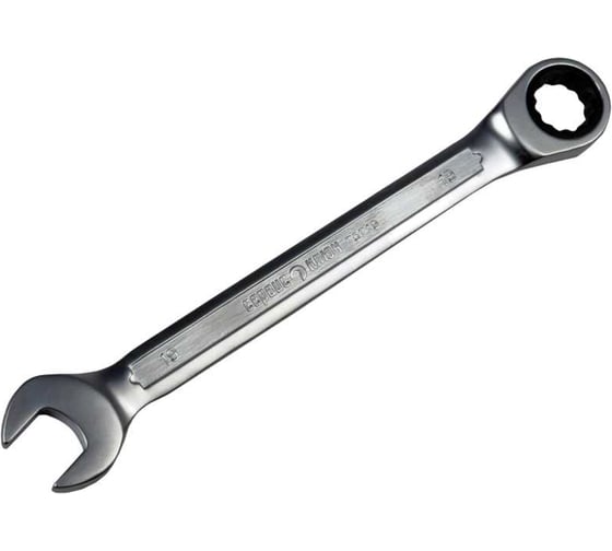 Ключ изготавливается из хромованадиевой стали методом холодного штампа, твердости 46-50 HRC, с дополнительным защитным покрытием с матовым эффектом для защиты от коррозии. За счет трещоточного механизма (38 зубцов) в вашей работе с инструментом прибавляется комфорт и повышается скорость работы. Размер ключа – 19 мм. 12-гранный профиль накидного зева увеличивает площадь контакта с поверхностью крепежа и упрощает работу со «сложным» крепежом. Длина ключа – 245 мм, толщина – 5 мм, толщина рожковой части – 9 мм, трещоточной – 12 мм. Вес инструмента – 240 грамм.