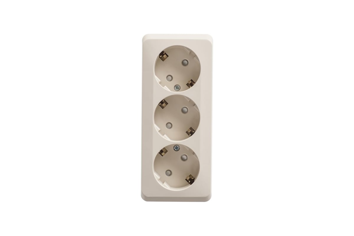 Розетка Systeme Electric (ранее Schneider Electric) ЭТЮД (кремовый, открытой установки) трёхместная с заземлением и шторкам.