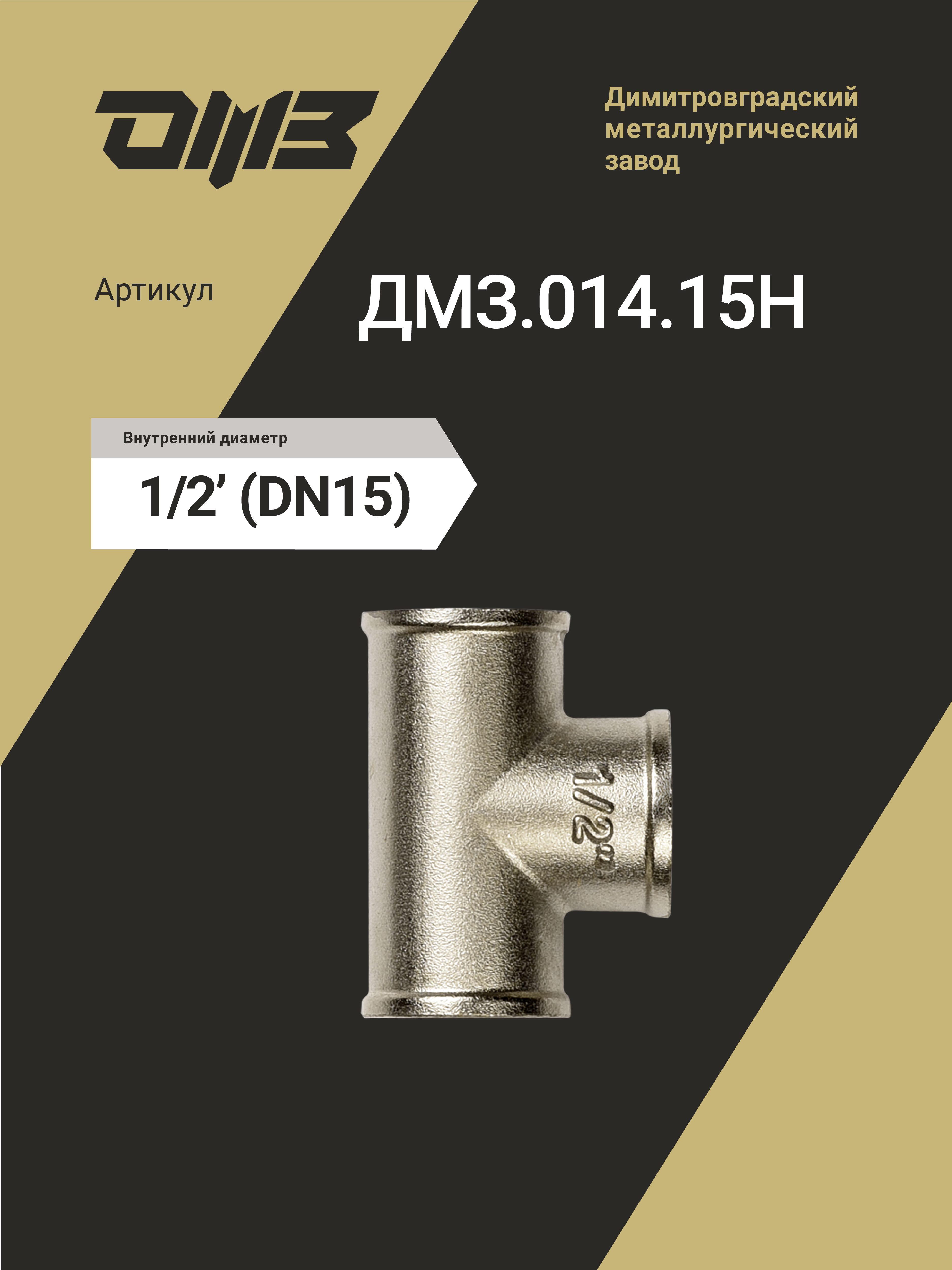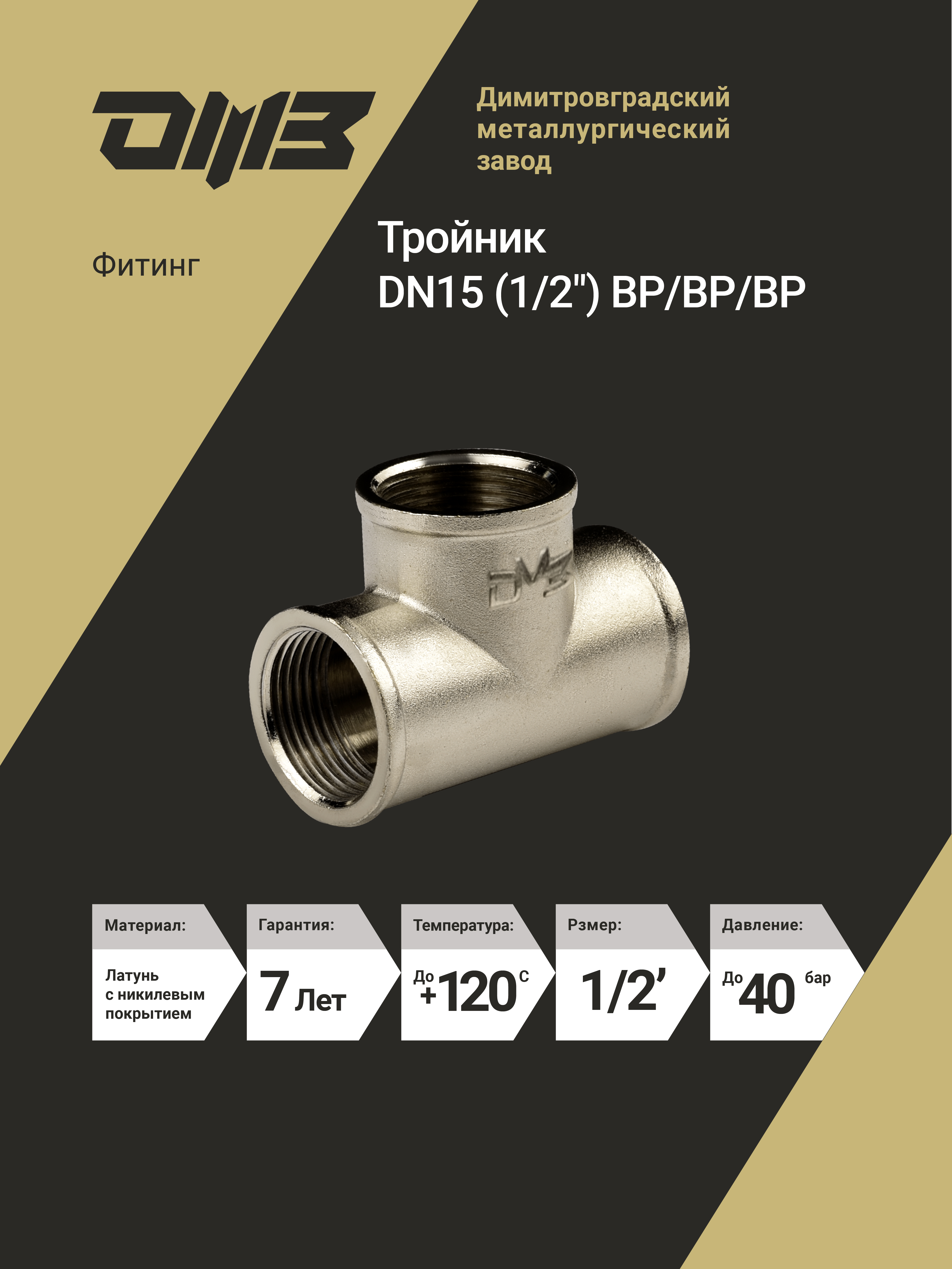 Тройник ДМЗ DN15 (1/2") ВР/ВР/ВР латунь никель (упаковка 5 шт) ДМЗ.014.15Н5