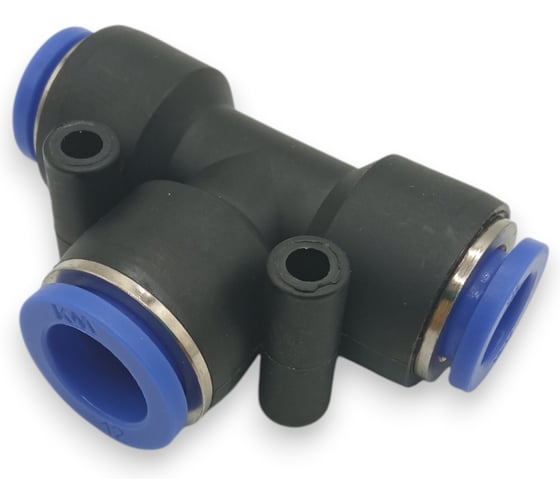 Пневматический фитинг-тройник для разветвления трубопроводов и подачи сжатого воздуха в промышленных системах автоматизации и пневмопривода.