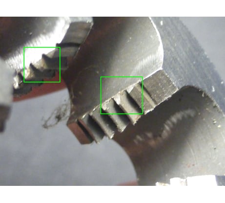 С одной стороны у 2-х гребенок из 6 грубо стесаны режущие кромки (на фото дефекты обведены зеленым) С другой стороны та же картина на 2-х других гребенках. Резать резьбу, вероятно, сможет, но с излишними усилиями и не чистую. Я не стал проверять - лучше верну покупку назад и поищу на рынке плашку "из старых советских запасов". Лучше уж ржавенькая, но рабочая, чем блестящая халтура. Отмою и подточу, если потребуется.