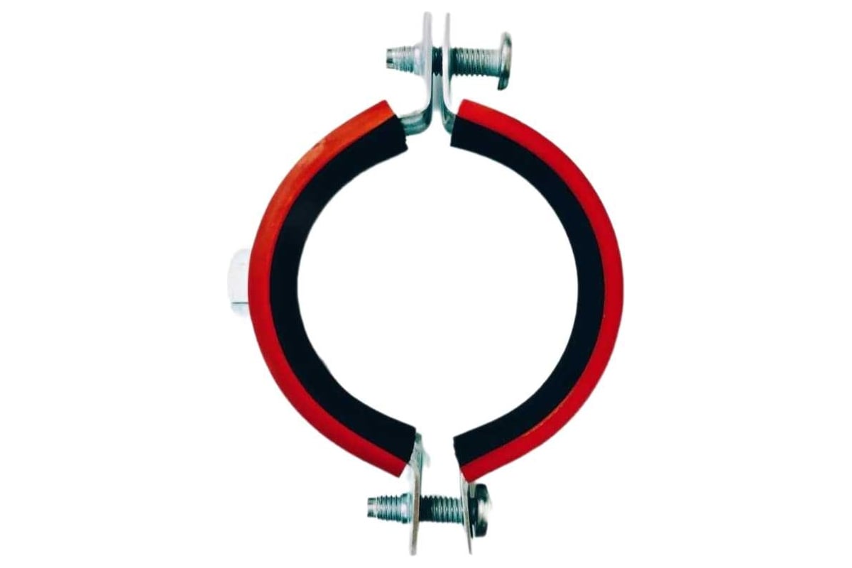 Сантехнические трубные хомуты для крепления водопроводных и канализационных труб снабжены резиновым профилем и приварной гайкой. Стандартные металлические крепежи с резиновым профилем предлагаются с болтом на М10.