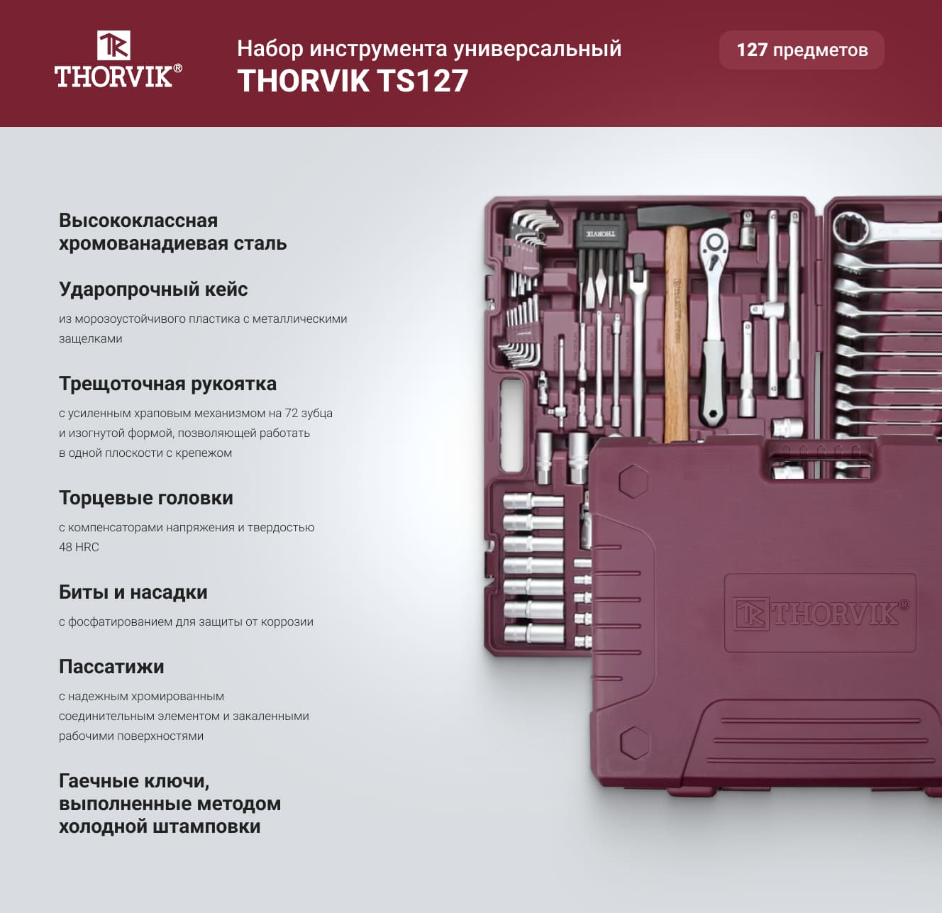Универсальный набор инструмента THORVIK TS127 1/4", 1/2"DR, 127 предметов 054014