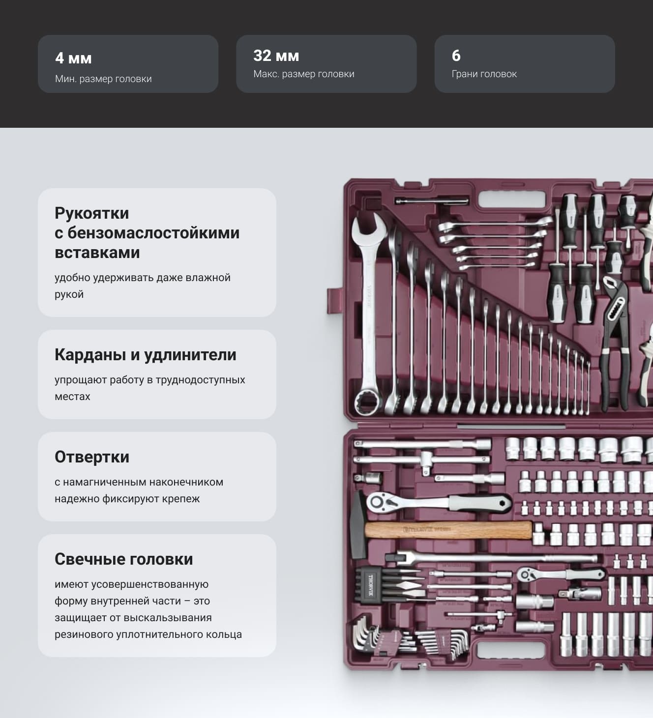 Инструментальные наборы Thorvik - это высокое качество изделий, входящих в состав наборов, удобные прочные кейсы для хранения, оптимальная комплектация позволяющая удовлетворить потребность мастера при обслуживании техники и обеспечить всем необходимым рабочее место при производстве комплексных слесарно-монтажных или механосборочных работ. Наборы Thorvik имеют ударопрочный морозоустойчивый кейс с надёжными защелками. Самые полные и удобные по наполнению комплектации для всех типов задач. Область применения. Универсальный набор инструмента с адаптированным ассортиментом изделий, позволяющих производить определенный спектр операций по обслуживанию различных резьбовых соединений, включая обслуживание непрофилированных деталей и деталей с разнообразными внутренними рабочими профилями.