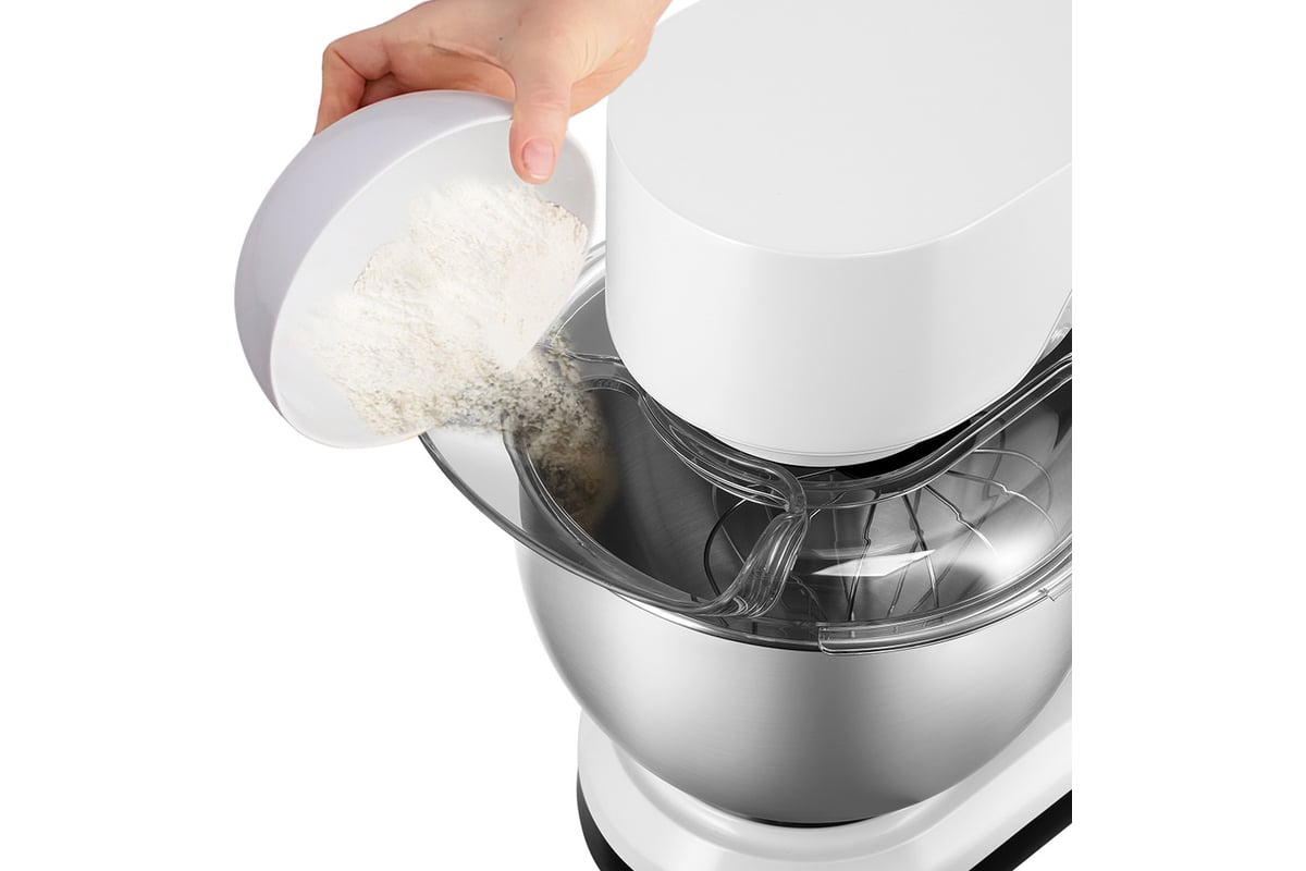 Крышка предотвращает разбрызгивание ингредиентов при замешивании. Через загрузочное отверстие в крышке можно добавлять ингредиенты во время работы, не выключая миксер и не поднимая моторный блок.