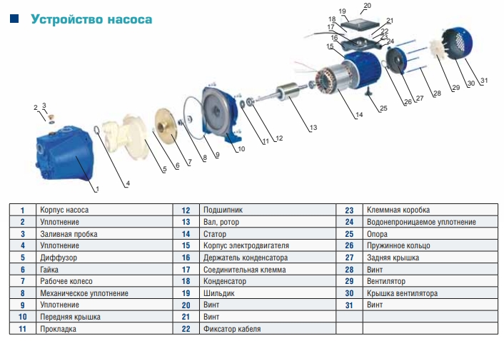 - Вал из нержавеющей стали - для долгого срока службы насоса;