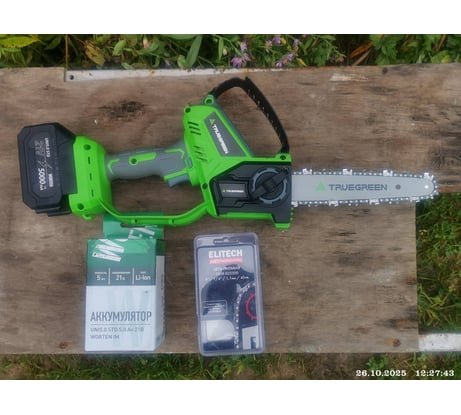 Теперь в отзывы можно добавлять и видео! Напомню комплект: Аккумуляторная цепная мини пила TRUEGREEN 20 В без аккумулятора и ЗУ TG8J133-1 (шина 8") + Аккумулятор WORTEN UNI5.0 STD, 5.0Ач 21В КА-90000586 + Пильная цепь Elitech 0809.023500 209341 + Зарядка штырьковая от др. китайского АКБ