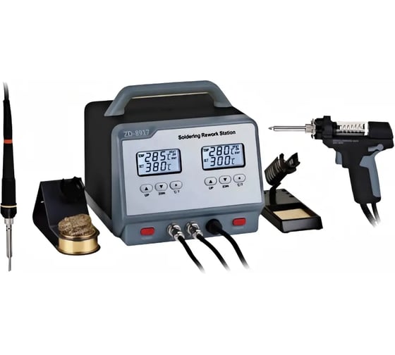 ZD-8917 90Вт Цифровая демонтажная паяльная станция 89-1722 Zhongdi 00-00017244 - это профессиональная рабочая станция «2 в 1», сочетающая в себе паяльник и демонтажную станцию с двумя ЖК-дисплеями, регулируемой температурой и высококачественными керамическими нагревателями для эффективного ремонта электроники.