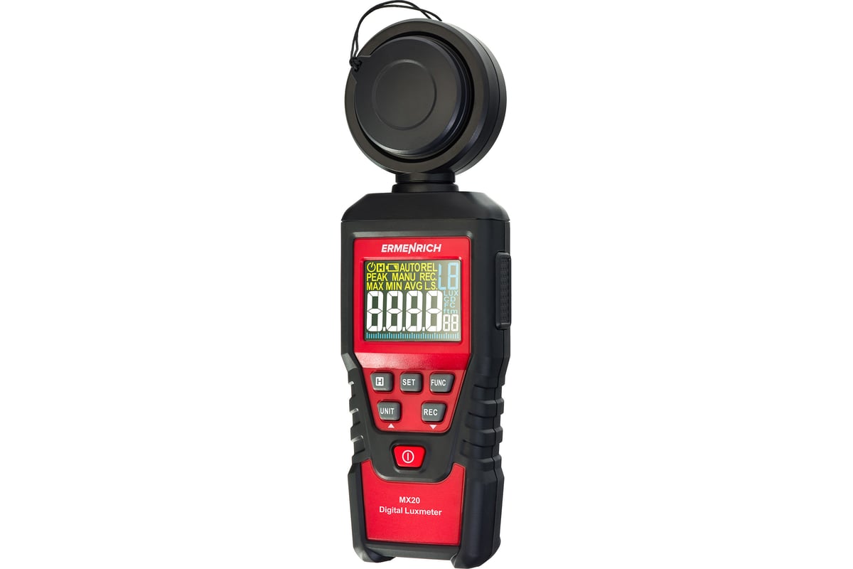 Цифровой люксметр Ermenrich Seek MX20 – прибор для быстрого и точного измерения уровня освещения. Он оснащен блоком со световым датчиком, цветным экраном с графической шкалой и простым кнопочным управлением.