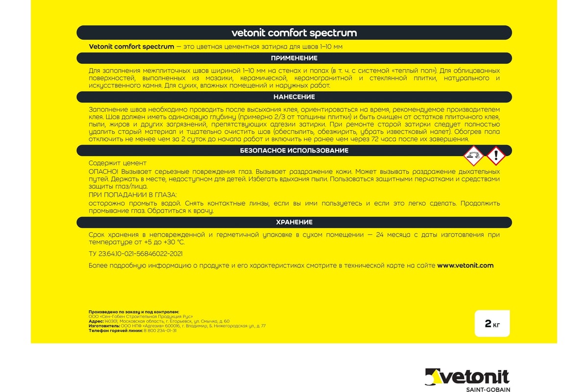Цветная цементная затирка для швов 1-10 мм. Подходит для облицованных поверхностей, выполненных из мозаики, керамической, керамогранитной и стеклянной плитки, натурального и искусственного камня. Благодаря специальным добавкам в составе, затирка долговечна, подходит для использования внутри и снаружи зданий, в сухих и влажных помещениях и в бассейнах. Угловые и деформационные стыки (стена-стена, стена-пол) рекомендуется заполнять цветным силиконовым герметиком vetonit comfort sil цветом, подходящим под цвет затирки.
