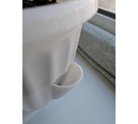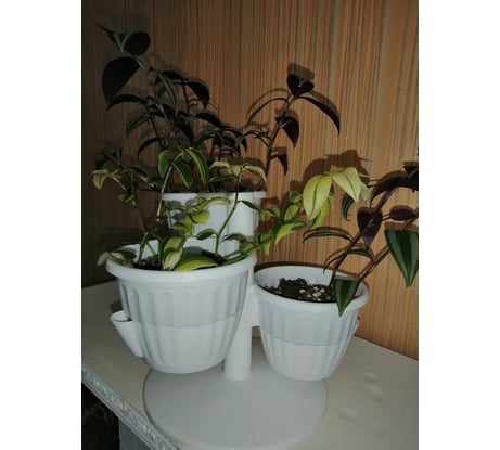 Интересная форма. Подойдёт для тех, у кого мало места. Для не больших растений. Красиво смотрятся вьющийся растения. Брала на работу. Состоит из двух частей. В верхней грунт, в нижнюю стекает вода, которую можно слить через нижний носик.