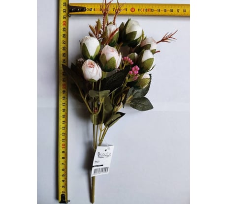Цветы изготовлены качественно из пластика и ткани. Размеры соответствуют заявленным (32см). Хорошо смотрятся. Не выделяют токсичных веществ, без запаха, безопасны в использовании. Отличное соотношение цена/качество (покупала со скидкой).